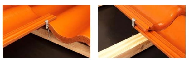 Spona sa jednoducho založí o bočný bezpečnostný žliabok škridle a otočný hák sa ukotví do strešnej laty. Takto vytvára pevný spoj a škridla tak ostáva na svojom mieste. Spona je vyrobená z oceľového drôtu s antikoróznym povrchom.