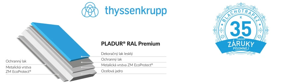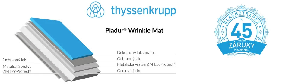Obojstranne zinkované plechy, vďaka čomu je vytvorená antikorózna povrchová vrstva, ako aj základná ochranná farba a organická farba. Posledná vrstva dodáva farbu a štruktúru a tiež chráni pred pôsobením vonkajších poveternostných vplyvov.