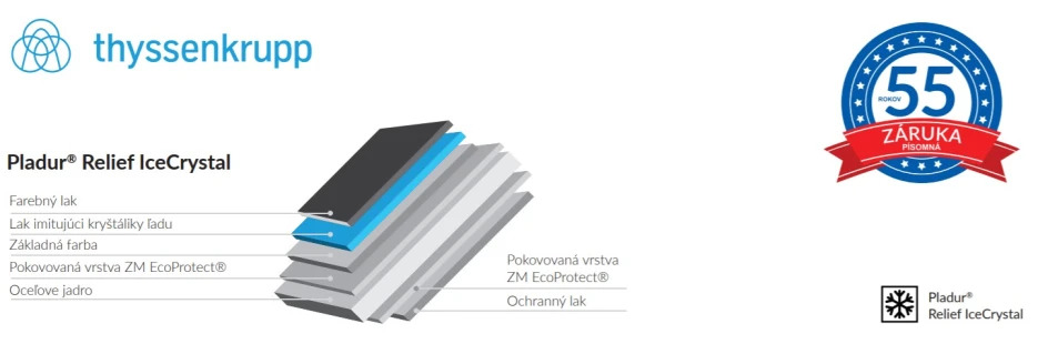 Plech z patentovanou štruktúrou povrchovej úpravy, ktorá imituje kryštáliky ľadu, 3-vrstvový povrchový náter, hrúbka povrchovej úpravy min. 36 mikrónov.